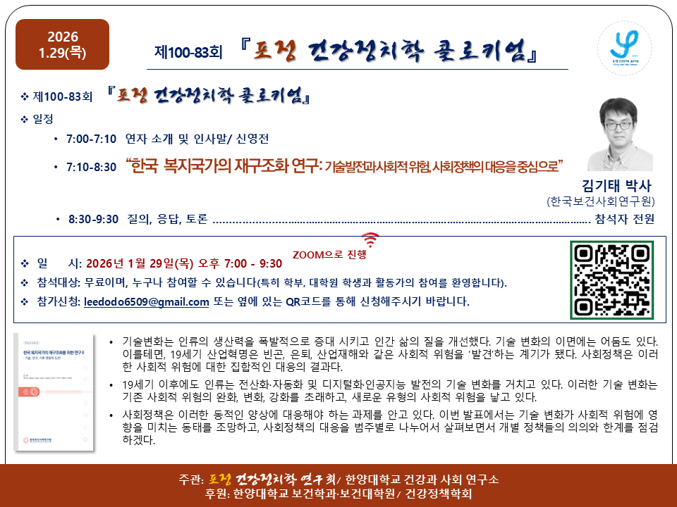 2026.1.29. 포정 건강정치학 콜로키엄 - 한국 복지국가의 재구조화 연구